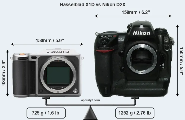 An illustration of the physical size and weight of the Hasselblad X1D and the Nikon D2X is provided in the side-by-side display below. The two cameras are presented according to their relative size. Three consecutive perspectives from the front, the top, and the back are available. All width, height and depth dimensions are rounded to the nearest millimeter.