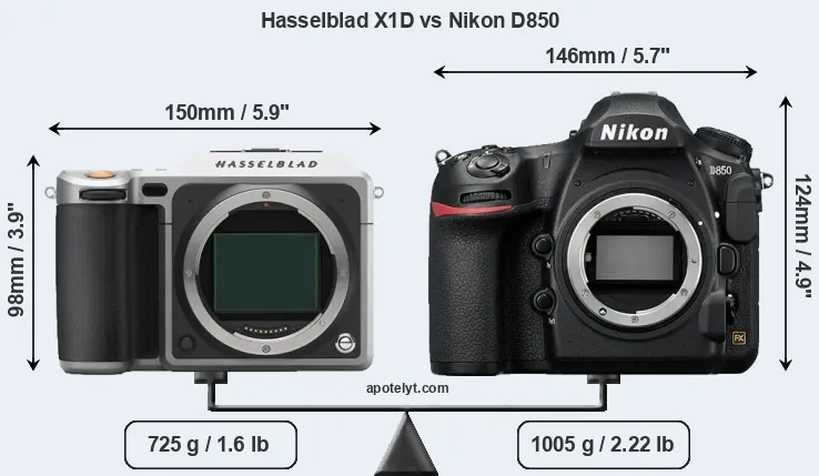 The physical size and weight of the Hasselblad X1D and the Nikon D850 are illustrated in the side-by-side display below. The two cameras are presented according to their relative size. Three consecutive perspectives from the front, the top, and the back are available. All width, height and depth dimensions are rounded to the nearest millimeter.