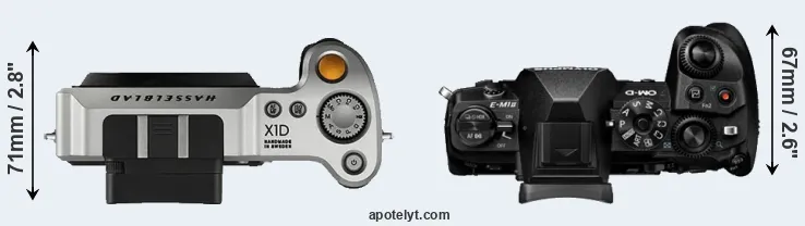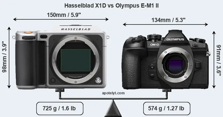 An illustration of the physical size and weight of the Hasselblad X1D and the Olympus E-M1 II is provided in the side-by-side display below. The two cameras are presented according to their relative size. Three consecutive perspectives from the front, the top, and the back are available. All width, height and depth measures are rounded to the nearest millimeter.