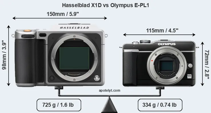 If the front view area (width x height) of the cameras is taken as an aggregate measure of their size, the Olympus E-PL1 is considerably smaller (44 percent) than the Hasselblad X1D. Moreover, the E-PL1 is substantially lighter (54 percent) than the X1D. It is worth mentioning in this context that the X1D is splash and dust resistant, while the E-PL1 does not feature any corresponding weather-sealing.