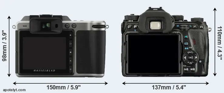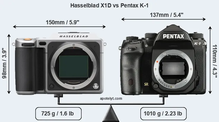 The side-by-side display below illustrates the physical size and weight of the Hasselblad X1D and the Pentax K-1. The two cameras are presented according to their relative size. Three consecutive perspectives from the front, the top, and the back are available. All width, height and depth measures are rounded to the nearest millimeter.