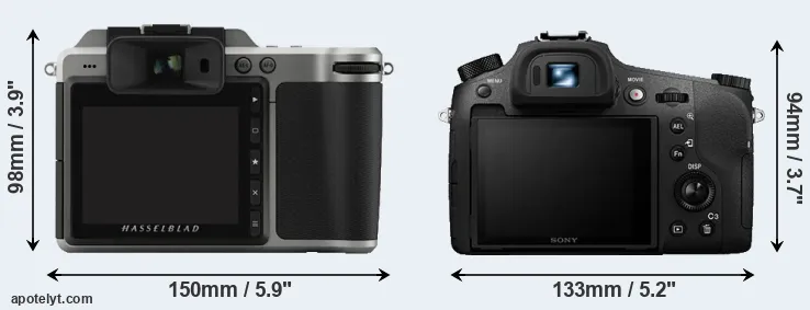 The side-by-side display below illustrates the physical size and weight of the Hasselblad X1D and the Sony RX10 III. The two cameras are presented according to their relative size. Three consecutive perspectives from the front, the top, and the back are available. All size dimensions are rounded to the nearest millimeter.