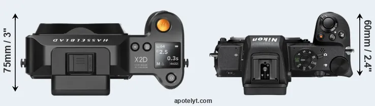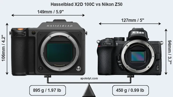 The physical size and weight of the Hasselblad X2D 100C and the Nikon Z50 are illustrated in the side-by-side display below. The two cameras are presented according to their relative size. Three successive views from the front, the top, and the rear are shown. All width, height and depth dimensions are rounded to the nearest millimeter.
