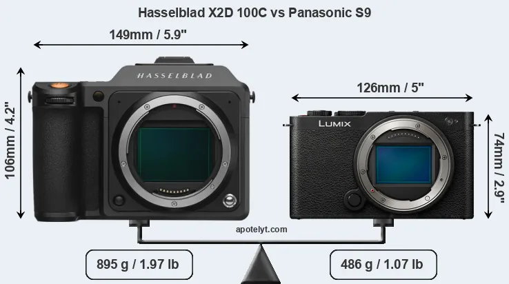 If the front view area (width x height) of the cameras is taken as an aggregate measure of their size, the Panasonic S9 is considerably smaller (41 percent) than the Hasselblad X2D 100C. Moreover, the S9 is substantially lighter (46 percent) than the X2D 100C. It is worth mentioning in this context that the X2D 100C is splash and dust resistant, while the S9 does not feature any corresponding weather-sealing.