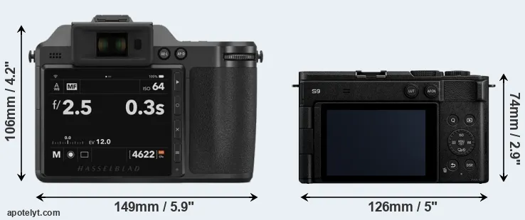 The side-by-side display below illustrates the physical size and weight of the Hasselblad X2D 100C and the Panasonic S9. The two cameras are presented according to their relative size. Three successive views from the front, the top, and the rear are shown. All width, height and depth dimensions are rounded to the nearest millimeter.