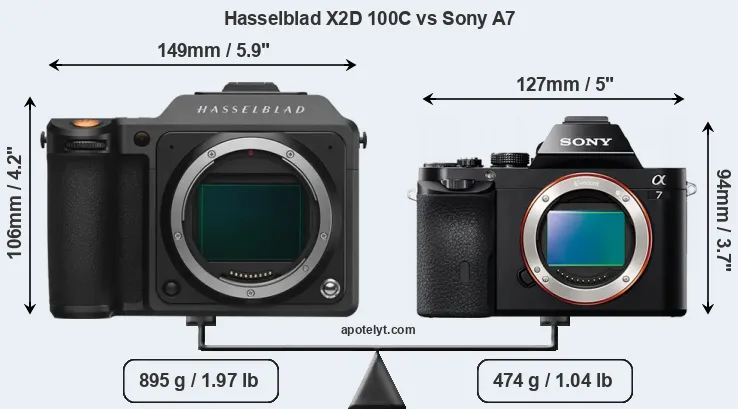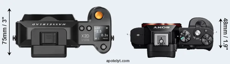 The physical size and weight of the Hasselblad X2D 100C and the Sony A7 are illustrated in the side-by-side display below. The two cameras are presented according to their relative size. Three successive views from the front, the top, and the rear are shown. All width, height and depth dimensions are rounded to the nearest millimeter.