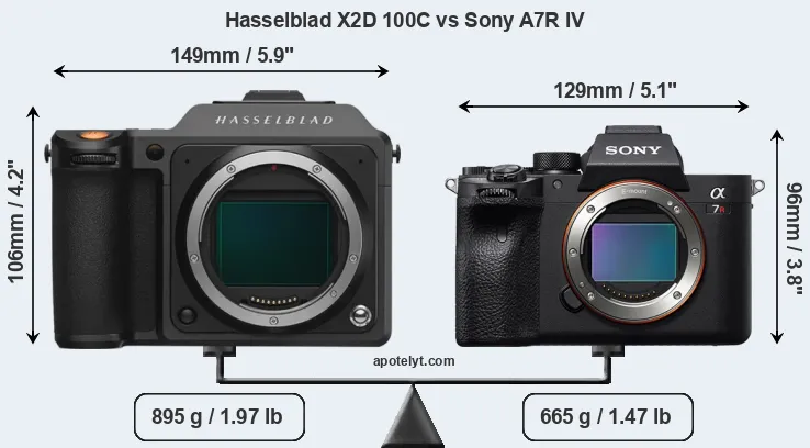 The side-by-side display below illustrates the physical size and weight of the Hasselblad X2D 100C and the Sony A7R IV. The two cameras are presented according to their relative size. Three consecutive views from the front, the top, and the rear side are shown. All width, height and depth dimensions are rounded to the nearest millimeter.