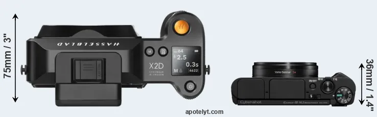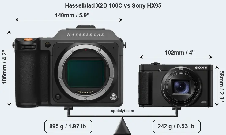 An illustration of the physical size and weight of the Hasselblad X2D 100C and the Sony HX95 is provided in the side-by-side display below. The two cameras are presented according to their relative size. Three successive views from the front, the top, and the rear are shown. All width, height and depth dimensions are rounded to the nearest millimeter.