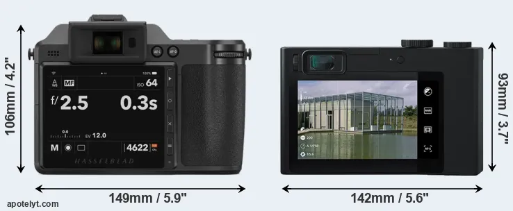 The physical size and weight of the Hasselblad X2D 100C and the Zeiss ZX1 are illustrated in the side-by-side display below. The two cameras are presented according to their relative size. Three consecutive views from the front, the top, and the rear side are shown. All width, height and depth measures are rounded to the nearest millimeter.