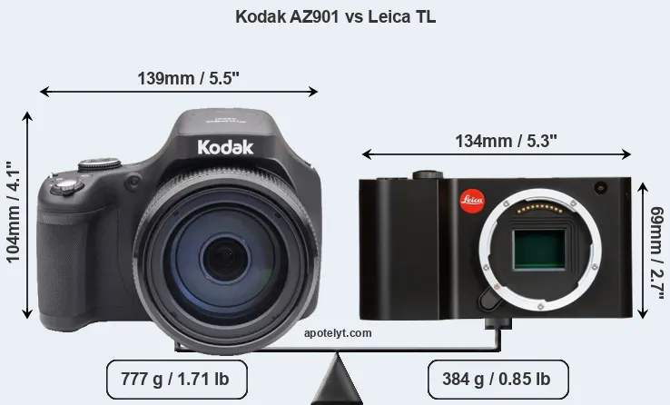 The physical size and weight of the Kodak AZ901 and the Leica TL are illustrated in the side-by-side display below. The two cameras are presented according to their relative size. Three consecutive perspectives from the front, the top, and the back are available. All width, height and depth dimensions are rounded to the nearest millimeter.
