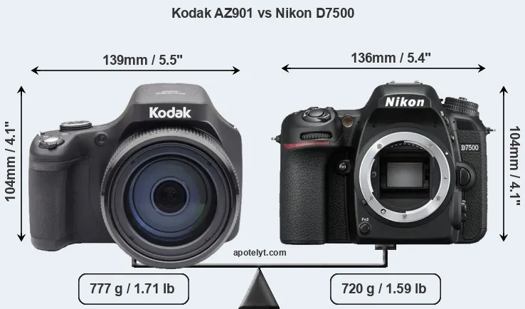 If the front view area (width x height) of the cameras is taken as an aggregate measure of their size, the Nikon D7500 is somewhat smaller (2 percent) than the Kodak AZ901. It is noteworthy in this context that the D7500 is splash and dust-proof, while the AZ901 does not feature any corresponding weather-sealing.