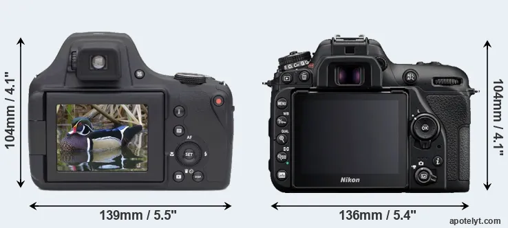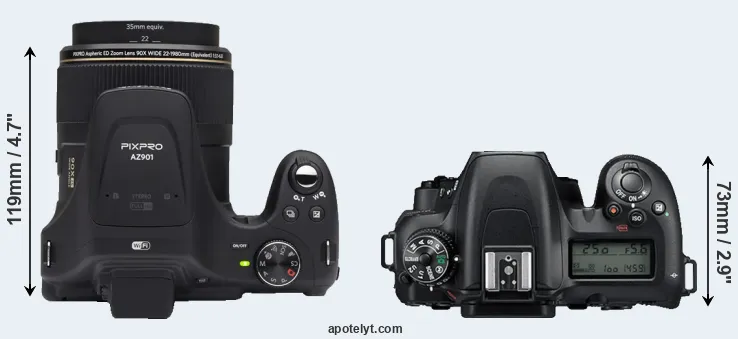 The above size and weight comparisons are to some extent incomplete and possibly misleading, as the AZ901 has a lens built in, whereas the D7500 is an interchangeable lens camera that requires a separate lens. Attaching the latter will add extra weight and bulk to the setup. You can compare the optics available for the D7500 and their specifications in the Nikon Lens Catalog.