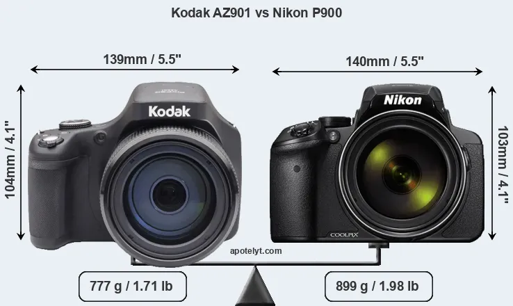 An illustration of the physical size and weight of the Kodak AZ901 and the Nikon P900 is provided in the side-by-side display below. The two cameras are presented according to their relative size. Three consecutive views from the front, the top, and the rear side are shown. All size dimensions are rounded to the nearest millimeter.