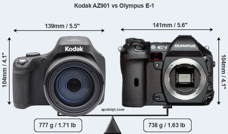If the front view area (width x height) of the cameras is taken as an aggregate measure of their size, the Olympus E-1 is somewhat larger (1 percent) than the Kodak AZ901. It is noteworthy in this context that the E-1 is splash and dust-proof, while the AZ901 does not feature any corresponding weather-sealing.
