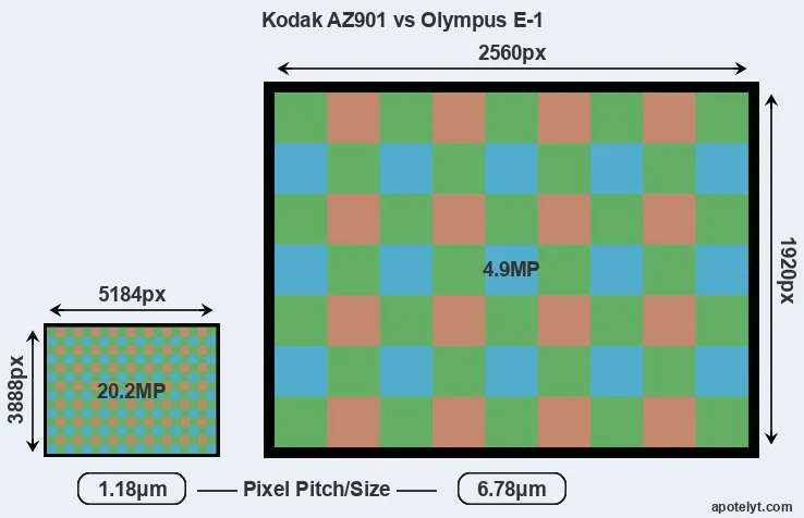 Despite having a smaller sensor, the Kodak AZ901 offers a higher resolution of 20.2 megapixels, compared with 4.9 MP of the Olympus E-1. This megapixels advantage comes at the cost of a higher pixel density and a smaller size of the individual pixel (with a pixel pitch of 1.18μm versus 6.78μm for the E-1). However, it should be noted that the AZ901 is much more recent (by 12 years and 6 months) than the E-1, and its sensor will have benefitted from technological advances during this time that make it possible to gather light more efficiently.