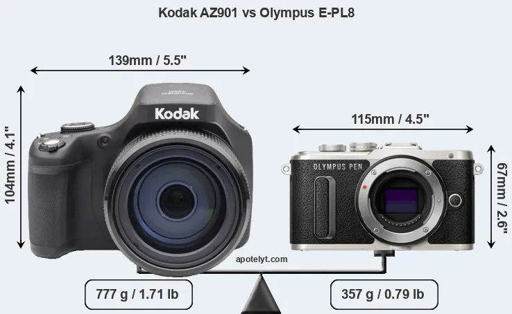 The physical size and weight of the Kodak AZ901 and the Olympus E-PL8 are illustrated in the side-by-side display below. The two cameras are presented according to their relative size. Three consecutive views from the front, the top, and the rear side are shown. All size dimensions are rounded to the nearest millimeter.
