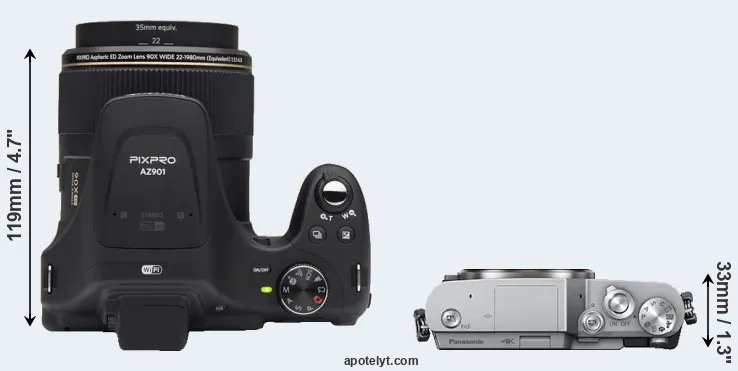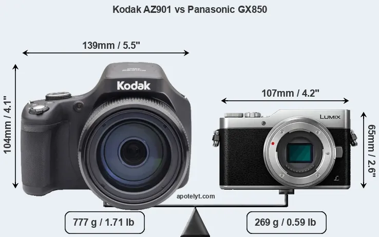The side-by-side display below illustrates the physical size and weight of the Kodak AZ901 and the Panasonic GX850. The two cameras are presented according to their relative size. Three successive views from the front, the top, and the rear are shown. All size dimensions are rounded to the nearest millimeter.