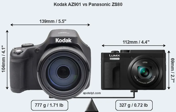 The side-by-side display below illustrates the physical size and weight of the Kodak AZ901 and the Panasonic ZS80. The two cameras are presented according to their relative size. Three consecutive views from the front, the top, and the rear side are shown. All size dimensions are rounded to the nearest millimeter.