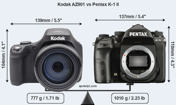 If the front view area (width x height) of the cameras is taken as an aggregate measure of their size, the Pentax K-1 II is somewhat larger (4 percent) than the Kodak AZ901. It is noteworthy in this context that the K-1 II is splash and dust-proof, while the AZ901 does not feature any corresponding weather-sealing.