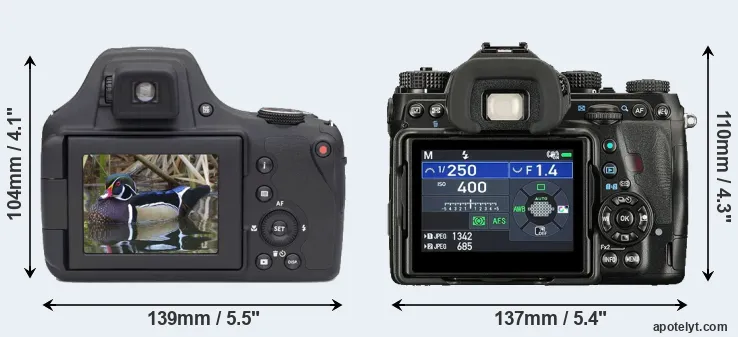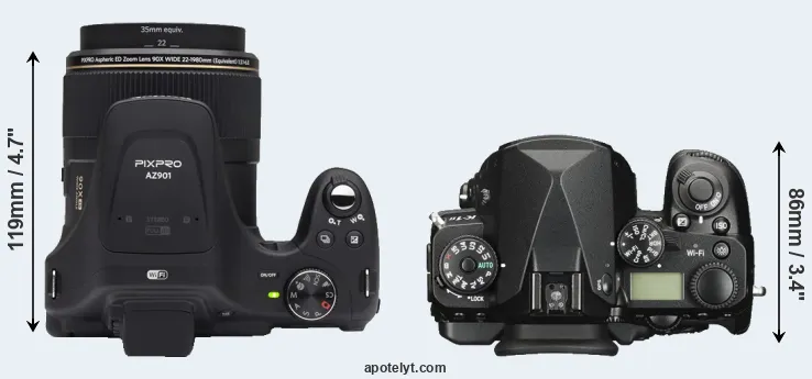 The above size and weight comparisons are to some extent incomplete and possibly misleading, as the AZ901 has a lens built in, whereas the K-1 II is an interchangeable lens camera that requires a separate lens. Attaching the latter will add extra weight and bulk to the setup.