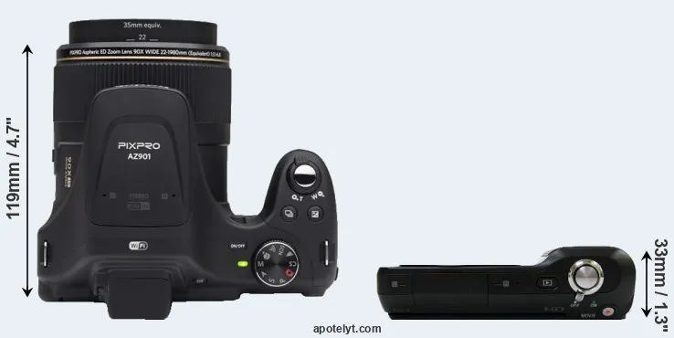 The physical size and weight of the Kodak AZ901 and the Sony NEX-3 are illustrated in the side-by-side display below. The two cameras are presented according to their relative size. Three consecutive views from the front, the top, and the rear side are shown. All size dimensions are rounded to the nearest millimeter.