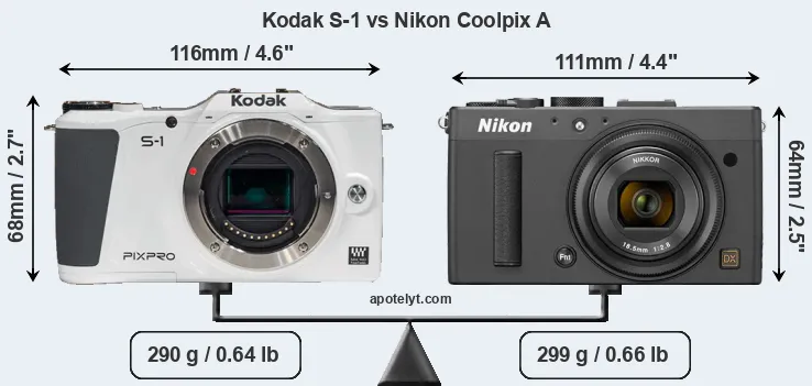 The side-by-side display below illustrates the physical size and weight of the Kodak S-1 and the Nikon Coolpix A. The two cameras are presented according to their relative size. Three consecutive views from the front, the top, and the rear side are shown. All width, height and depth dimensions are rounded to the nearest millimeter.