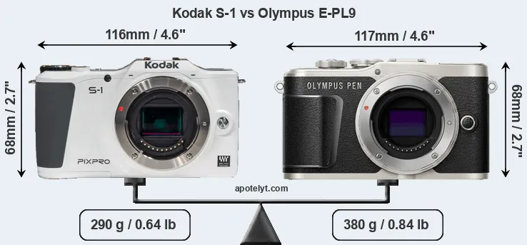 The side-by-side display below illustrates the physical size and weight of the Kodak S-1 and the Olympus E-PL9. The two cameras are presented according to their relative size. Three consecutive perspectives from the front, the top, and the back are available. All width, height and depth measures are rounded to the nearest millimeter.
