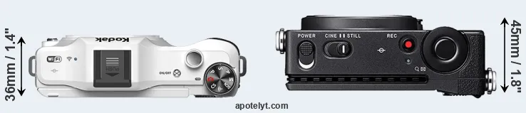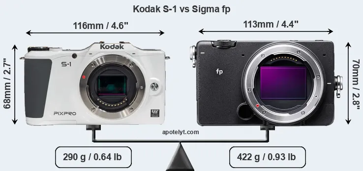 If the front view area (width x height) of the cameras is taken as an aggregate measure of their size, the Kodak S-1 and the Sigma fp are of equal size. However, the fp is substantially heavier (46 percent) than the S-1. It is noteworthy in this context that the fp is splash and dust-proof, while the S-1 does not feature any corresponding weather-sealing.