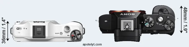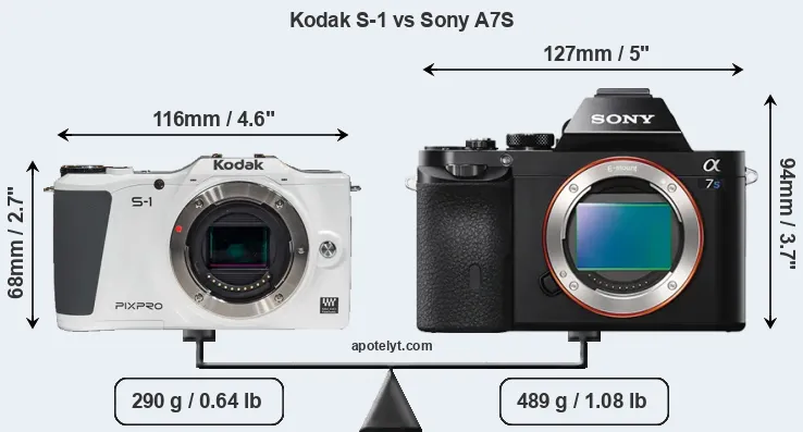 If the front view area (width x height) of the cameras is taken as an aggregate measure of their size, the Sony A7S is considerably larger (51 percent) than the Kodak S-1. Moreover, the A7S is substantially heavier (69 percent) than the S-1. It is noteworthy in this context that the A7S is splash and dust-proof, while the S-1 does not feature any corresponding weather-sealing.