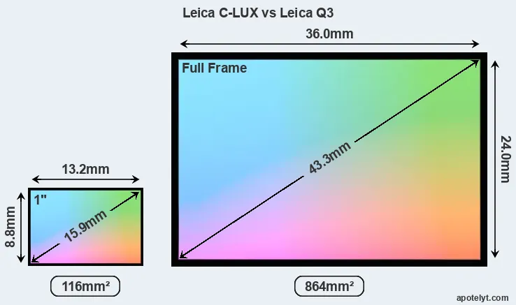 Of the two cameras under consideration, the Leica C-LUX features an one-inch sensor and the Leica Q3 a full frame sensor. The sensor area in the Q3 is 645 percent bigger. As a result of these sensor size differences, the cameras have a format factor of, respectively, 2.7 and 1.0. Both cameras have a native aspect ratio (sensor width to sensor height) of 3:2.