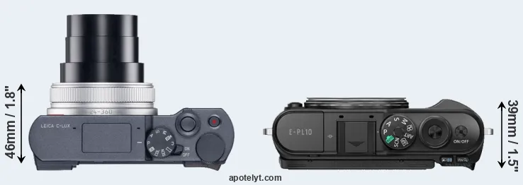 The side-by-side display below illustrates the physical size and weight of the Leica C-LUX and the Olympus E-PL10. The two cameras are presented according to their relative size. Three consecutive perspectives from the front, the top, and the back are available. All size dimensions are rounded to the nearest millimeter.