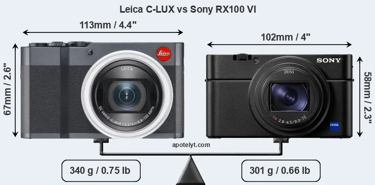 The physical size and weight of the Leica C-LUX and the Sony RX100 VI are illustrated in the side-by-side display below. The two cameras are presented according to their relative size. Three successive views from the front, the top, and the rear are shown. All width, height and depth dimensions are rounded to the nearest millimeter.