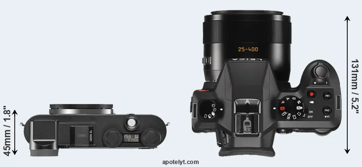 The physical size and weight of the Leica CL and the Leica V-LUX Typ 114 are illustrated in the side-by-side display below. The two cameras are presented according to their relative size. Three consecutive views from the front, the top, and the rear side are shown. All size dimensions are rounded to the nearest millimeter.