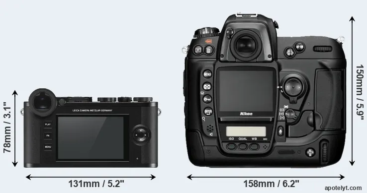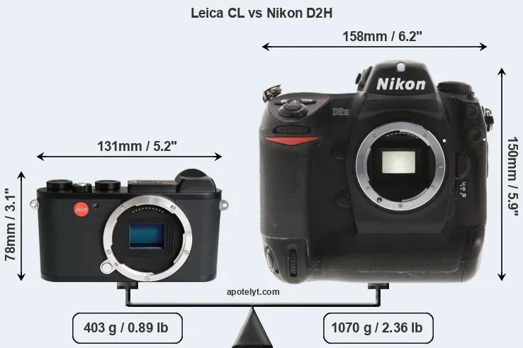 If the front view area (width x height) of the cameras is taken as an aggregate measure of their size, the Nikon D2H is considerably larger (132 percent) than the Leica CL. Moreover, the D2H is substantially heavier (166 percent) than the CL. It is noteworthy in this context that the D2H is splash and dust-proof, while the CL does not feature any corresponding weather-sealing.