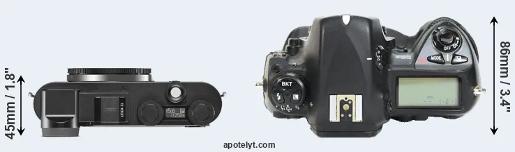 The side-by-side display below illustrates the physical size and weight of the Leica CL and the Nikon D2H. The two cameras are presented according to their relative size. Three consecutive views from the front, the top, and the rear side are shown. All width, height and depth dimensions are rounded to the nearest millimeter.