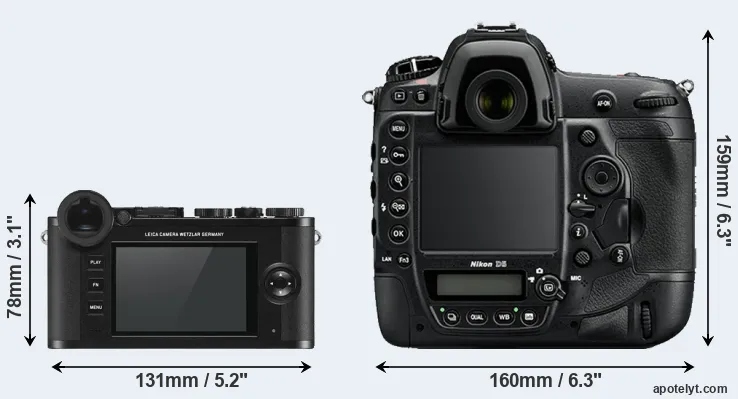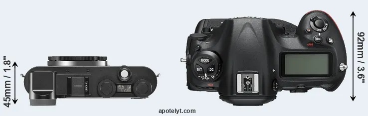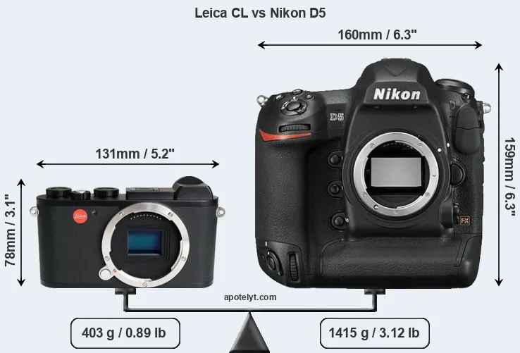 The side-by-side display below illustrates the physical size and weight of the Leica CL and the Nikon D5. The two cameras are presented according to their relative size. Three consecutive perspectives from the front, the top, and the back are available. All width, height and depth measures are rounded to the nearest millimeter.