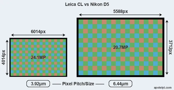 Despite having a smaller sensor, the Leica CL offers a higher resolution of 24.1 megapixels, compared with 20.7 MP of the Nikon D5. This megapixels advantage comes at the cost of a higher pixel density and a smaller size of the individual pixel (with a pixel pitch of 3.92μm versus 6.44μm for the D5). However, it should be noted that the CL is a somewhat more recent model (by 1 year and 10 months) than the D5, and its sensor might have benefitted from technological advances during this time that partly offset its pixel-size disadvantage. Coming back to sensor resolution, it should be mentioned that the CL has no anti-alias filter installed, so that it can capture all the detail its sensor resolves.
