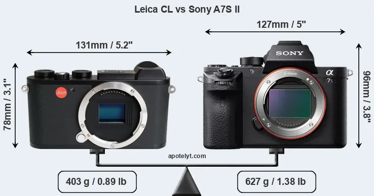 If the front view area (width x height) of the cameras is taken as an aggregate measure of their size, the Sony A7S II is notably larger (19 percent) than the Leica CL. Moreover, the A7S II is substantially heavier (56 percent) than the CL. It is noteworthy in this context that the A7S II is splash and dust-proof, while the CL does not feature any corresponding weather-sealing.