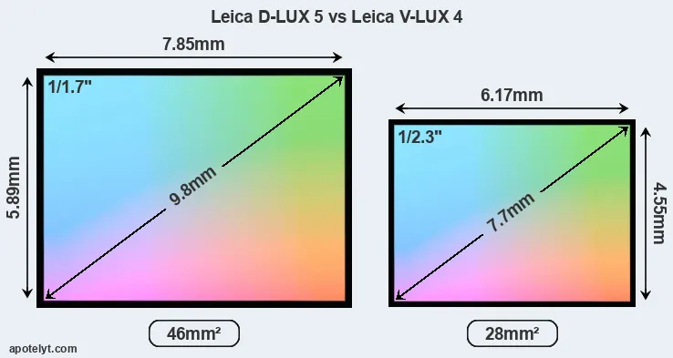 Of the two cameras under consideration, the Leica D-LUX 5 features a 1/1.7-inch sensor and the Leica V-LUX 4 a 1/2.3-inch sensor. The sensor area in the V-LUX 4 is 39 percent smaller. As a result of these sensor size differences, the cameras have a format factor of, respectively, 4.4 and 5.6. Both cameras feature a native aspect ratio (sensor width to sensor height) of 4:3. The D-LUX 5 has the particularity of featuring a switch that allows to toggle between multiple aspect ratios, while maintaining the same field of view and full image resolution.