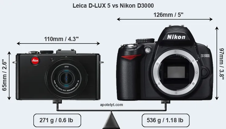 An illustration of the physical size and weight of the Leica D-LUX 5 and the Nikon D3000 is provided in the side-by-side display below. The two cameras are presented according to their relative size. Three consecutive perspectives from the front, the top, and the back are available. All size dimensions are rounded to the nearest millimeter.