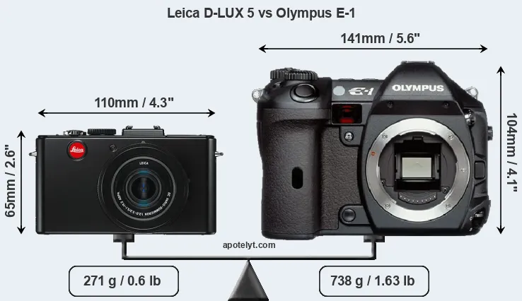 The above size and weight comparisons are to some extent incomplete and possibly misleading, as the D-LUX 5 has a lens built in, whereas the E-1 is an interchangeable lens camera that requires a separate lens. Attaching the latter will add extra weight and bulk to the setup. You can compare the optics available for the E-1 and their specifications in the Four Thirds Lens Catalog.
