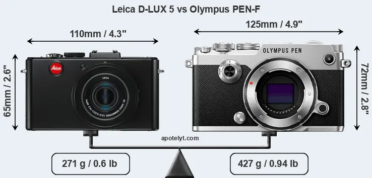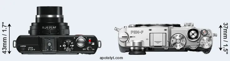 The above size and weight comparisons are to some extent incomplete and possibly misleading, as the D-LUX 5 has a lens built in, whereas the PEN-F is an interchangeable lens camera that requires a separate lens. Attaching the latter will add extra weight and bulk to the setup. You can compare the optics available for the PEN-F and their specifications in the Micro Four Thirds Lens Catalog.