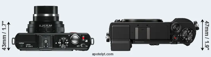 The side-by-side display below illustrates the physical size and weight of the Leica D-LUX 5 and the Panasonic GX9. The two cameras are presented according to their relative size. Three consecutive perspectives from the front, the top, and the back are available. All width, height and depth dimensions are rounded to the nearest millimeter.