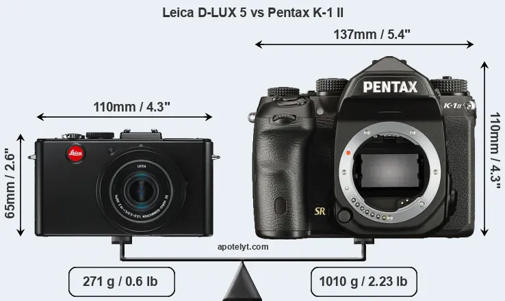 If the front view area (width x height) of the cameras is taken as an aggregate measure of their size, the Pentax K-1 II is considerably larger (111 percent) than the Leica D-LUX 5. It is noteworthy in this context that the K-1 II is splash and dust-proof, while the D-LUX 5 does not feature any corresponding weather-sealing.