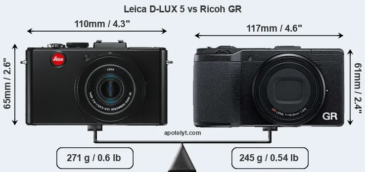 The Leica D-LUX 5 and the Ricoh GR are two digital cameras that were revealed to the public, respectively, in September 2010 and April 2013. Both the D-LUX 5 and the GR are fixed lens compact cameras that are based on a 1/1.7-inch (D-LUX 5) and an APS-C (GR) sensor. The Leica has a resolution of 10 megapixels, whereas the Ricoh provides 16.1 MP.