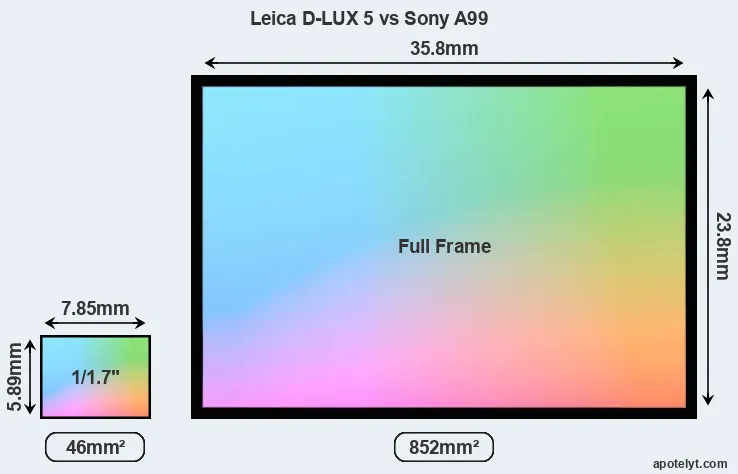 Of the two cameras under consideration, the Leica D-LUX 5 features a 1/1.7-inch sensor and the Sony A99 a full frame sensor. The sensor area in the A99 is 1752 percent bigger. As a result of these sensor size differences, the cameras have a format factor of, respectively, 4.4 and 1.0. The sensor in the D-LUX 5 has a native 4:3 aspect ratio, while the one in the A99 offers a 3:2 aspect. The D-LUX 5 has the particularity of featuring a switch that allows to toggle between multiple aspect ratios, while maintaining the same field of view and full image resolution.