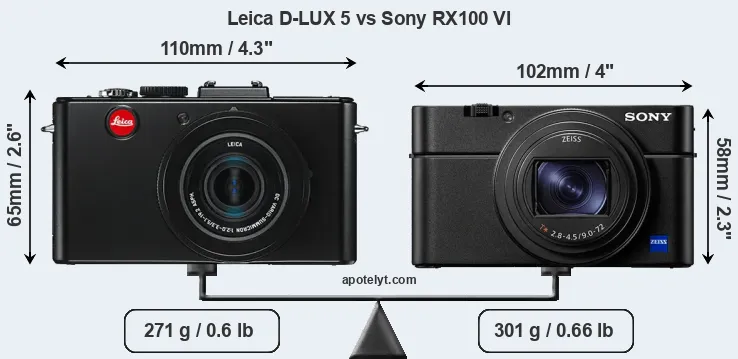 The physical size and weight of the Leica D-LUX 5 and the Sony RX100 VI are illustrated in the side-by-side display below. The two cameras are presented according to their relative size. Three successive views from the front, the top, and the rear are shown. All width, height and depth measures are rounded to the nearest millimeter.