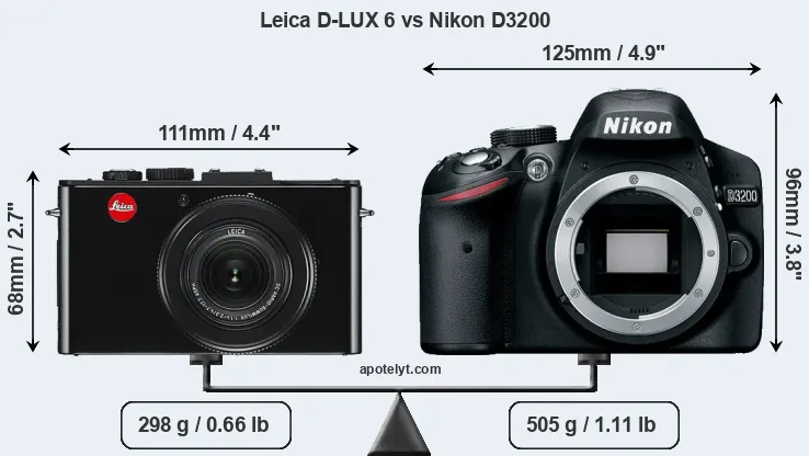 The side-by-side display below illustrates the physical size and weight of the Leica D-LUX 6 and the Nikon D3200. The two cameras are presented according to their relative size. Three consecutive views from the front, the top, and the rear side are shown. All width, height and depth dimensions are rounded to the nearest millimeter.