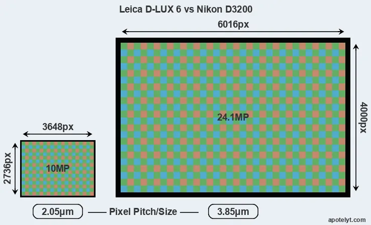 With 24.1MP, the D3200 offers a higher resolution than the D-LUX 6 (10MP), but the D3200 nevertheless has larger individual pixels (pixel pitch of 3.85μm versus 2.05μm for the D-LUX 6) due to its larger sensor. However, the D-LUX 6 is a somewhat more recent model (by 4 months) than the D3200, and its sensor might have benefitted from technological advances during this time that enhance the light gathering capacity of its pixel-units.