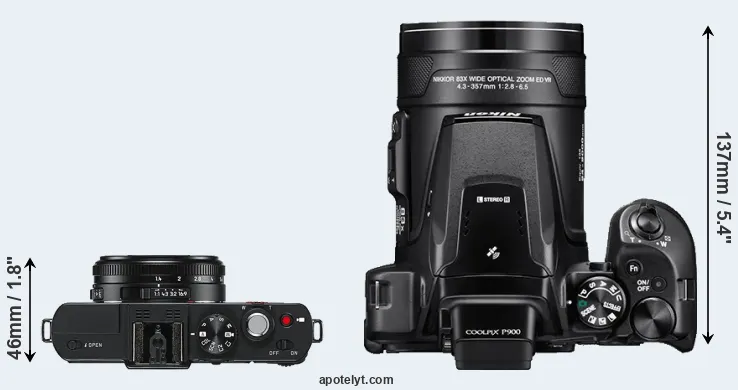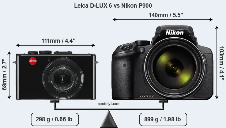 The physical size and weight of the Leica D-LUX 6 and the Nikon P900 are illustrated in the side-by-side display below. The two cameras are presented according to their relative size. Three consecutive perspectives from the front, the top, and the back are available. All width, height and depth measures are rounded to the nearest millimeter.